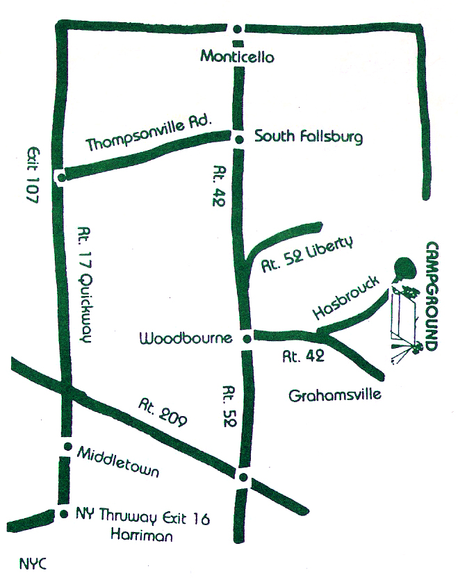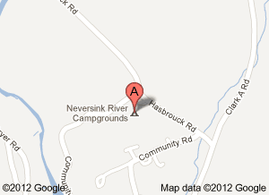Neversink River Campgrounds is easy to reach. Take New York State Thuway north to Exit 16, then take Route 17 (Quickway) to Exit 107 to South Fallsburg to Woodbourne. Make left at bridge to Hasbrouck sign, make sharp left to Campgrounds. Convenient to Bethel Woods Concert Center for the Arts (28 miles) and Monticello Raceway.