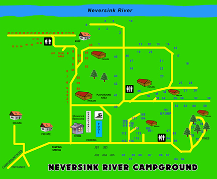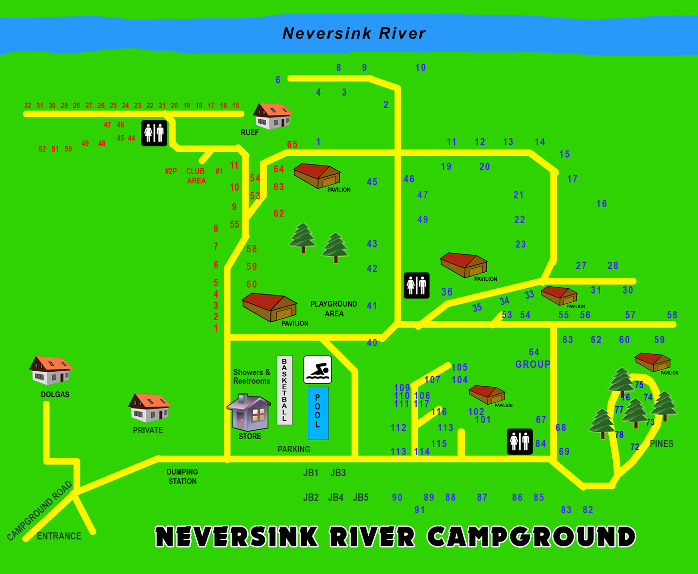 Download our map to familiarize yourself with the campground area. The map clearly depicts the location of all campground sites, pavilion, store, playground, swimming pool and restrooms around the campground.